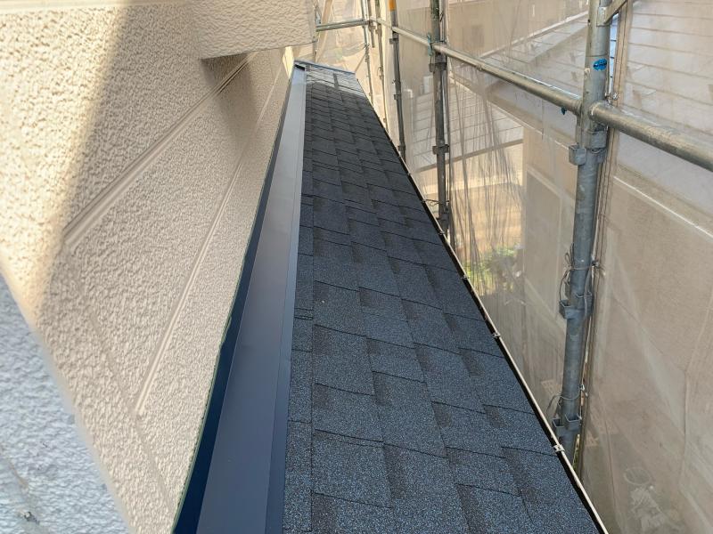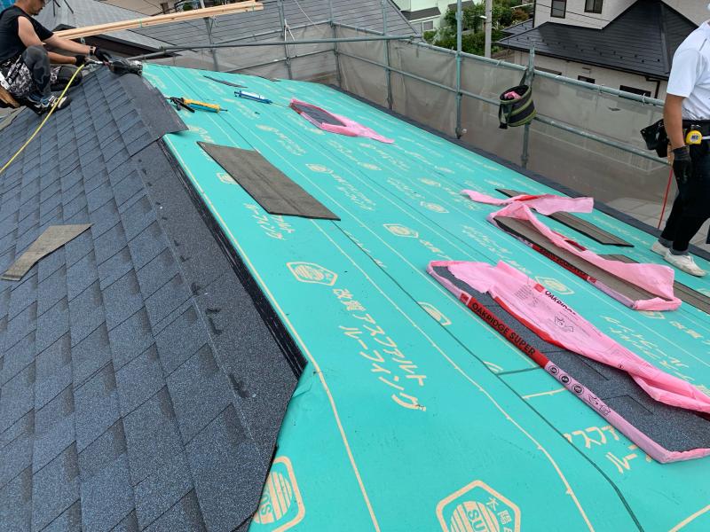 屋根ルーフィング材(防水シート)を敷き、その上に新規屋根材を葺きます。