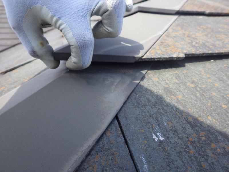 スレート屋根を留めておく「棟板金」が浮いてしまっています。