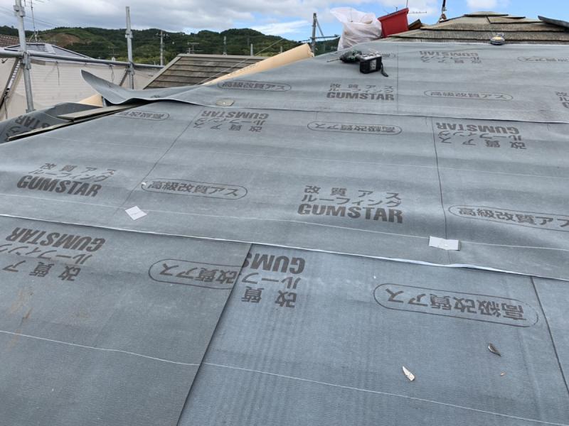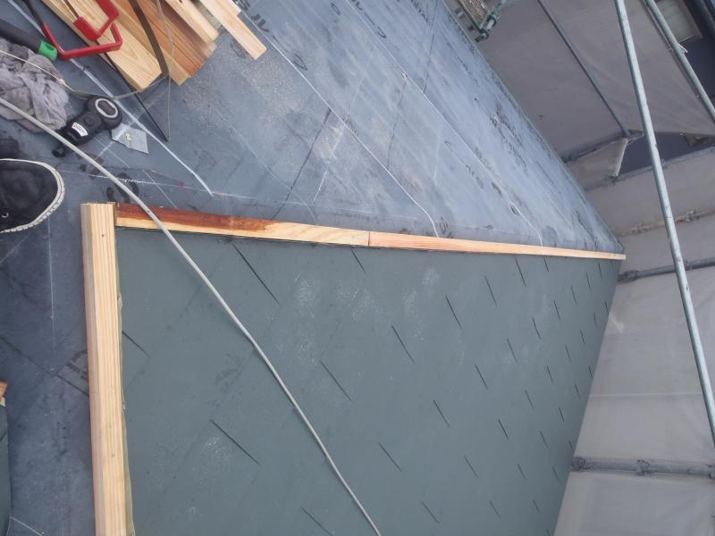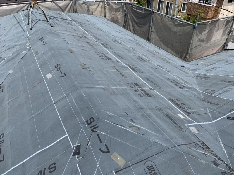 ルーフィング(屋根の防水シート)を敷いているところです。